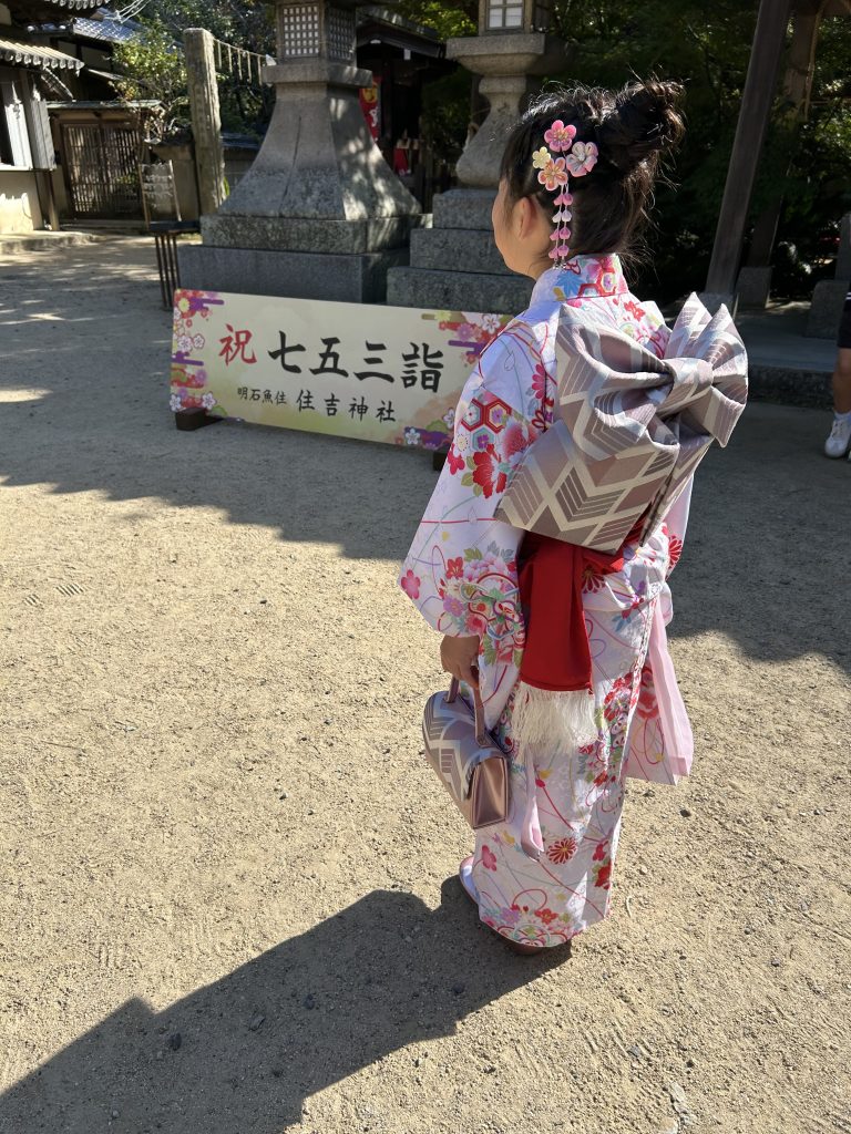着付けの先生が20分程度で着つけてくれました。作り帯っていうすでに帯がリボンの形になっているものは早いそうで、一本の帯だと+10分だとのことでした。7歳ともなるとぐずることもないので超スムーズでした。これが3歳だったら子供によってはぐずぐずもあるんだろうな。